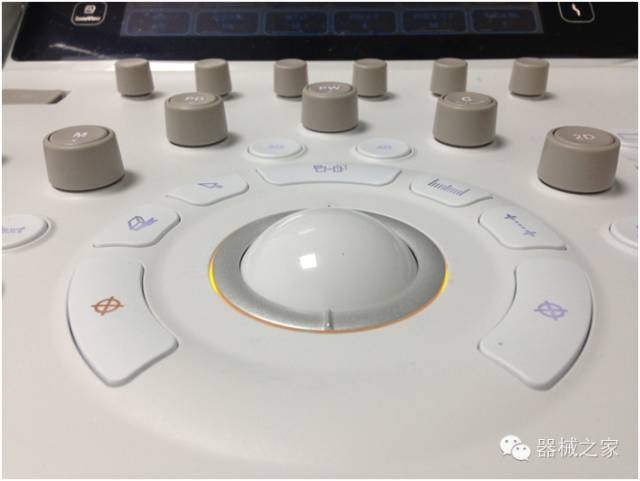 看到键盘的第一眼,我想到的是飞利浦的IU22!仔细看轨迹球周围,一共七颗按键。因为是白色的,并不显得很多。我的意思并不是抄袭,因为同样都是超声,布局难免会很相似,而眼前这款超声,融合许多简洁的设计,不禁感叹过,真是说到做到。键盘的布局就如同电视遥控器一样,工程师一直坚持自己的设计理念:把所有的按键都放上!而当今潮流的苹果和小米的遥控器已经简单的只剩几个键了。当然,超声的按键还真的不能说隐藏就隐藏。眼前这个键盘,其实按键真的不少,可是设计师利用颜色的搭配以及简略的图标,让人容易懂、容易找且不感到杂乱。通过询问,医生在学习这款型号的时候,操整体评价:很简单!没怎么学。
