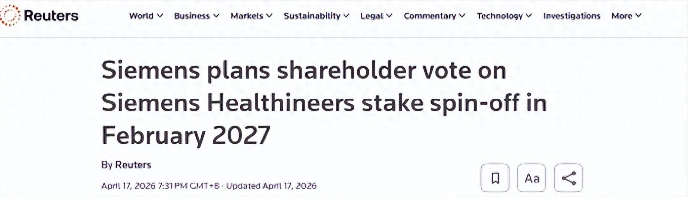 来源:器械之家,未经授权不得转载,且24小时后方可转载西门子(Siemens)于4月17日正式公布西门子医疗(SiemensHealthineers)分拆时间表,计划在2027年2月的年度股东大会上就“直接分拆”方案进行投票表决。此举标志着这家拥有175年历史的工业集团剥离医疗科技业务的战略进入关键