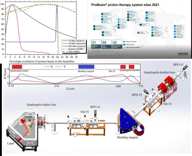 上图:(左图)相比于电子和光子,质子在介质中传播时具有深处的电离峰,可用于治疗体内深处肿瘤;(右图)瓦里安公司的ProBeam质子治疗系统在全球各地市场发展迅速。下图:北京大学CLAPA实验室激光质子加速束线,激光驱动的离子加速有望大大降低质子/重离子放疗成本