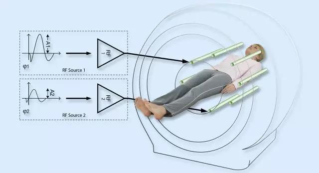 多源发射让射频源从单个发展到独立的两个射频发射源,并且每个都连接一个独立的射频放大器,发出的射频脉冲,其波形、相位、幅度和频率这些射频参数都可以完全独立地进行调节,最终作用于发射体线圈独立单元,实现基于个体差异的射频发射管理。