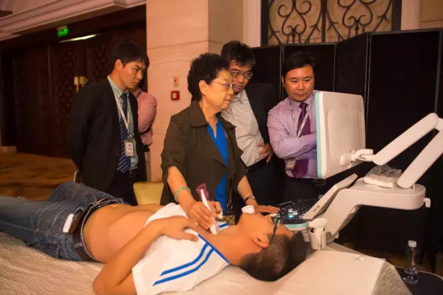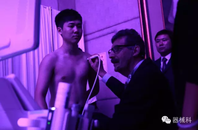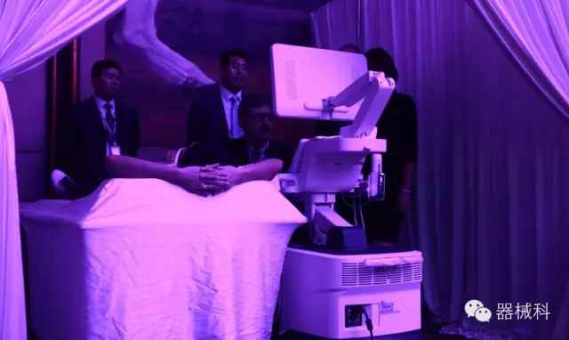 在此基础上,会场内小诊室的医师则通过实际地在人体身上打图,并将图像切到大屏幕显示,让大家能够清楚地看到机器的实时测试的直观效果。